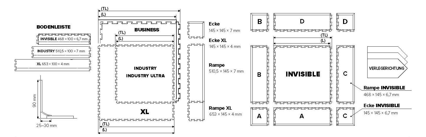 | Sockelleisten (Industry, Industry Ultra, XL, Invisible) | Sockelleiste für einen eleganten Abschluss des Bodens in der Nähe von Wänden und anderen festen Teilen. Die Leisten werden aus Fortelock Fliesen hergestellt, um eine perfekte Abstimmung von Farbe und Design zu erzielen. Für eine einfachere Montage wird empfohlen, die Installation auf eine Basissockelleiste vorzunehmen. | – |