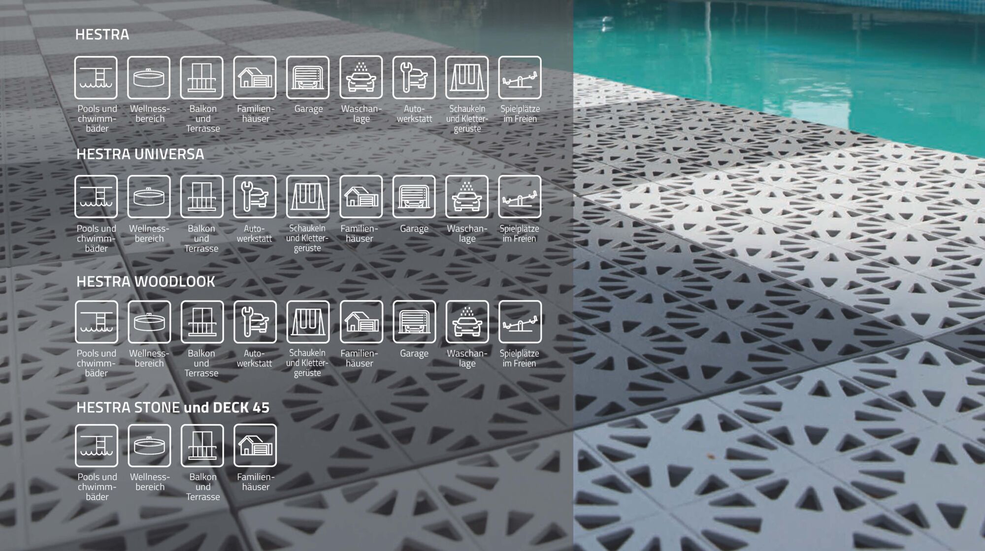 und Instandhaltung, aus. So eignet sich unsere Hestra Design Klickfliese ideal zur Bildung einer komfortablen Trittfläche von Böden mit einer hohen Betriebsbelastung, bei denen eine über dem Standard liegende Beständigkeit gegen Abrieb und Stöße gefordert wird. Mit ihrer besonderen Expansionsfunktion lässt sich die Hestra Design Klickfliese auch in sehr warmen Umgebungen und Feucht-/Nassbereichen einsetzen.
