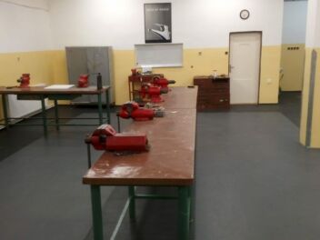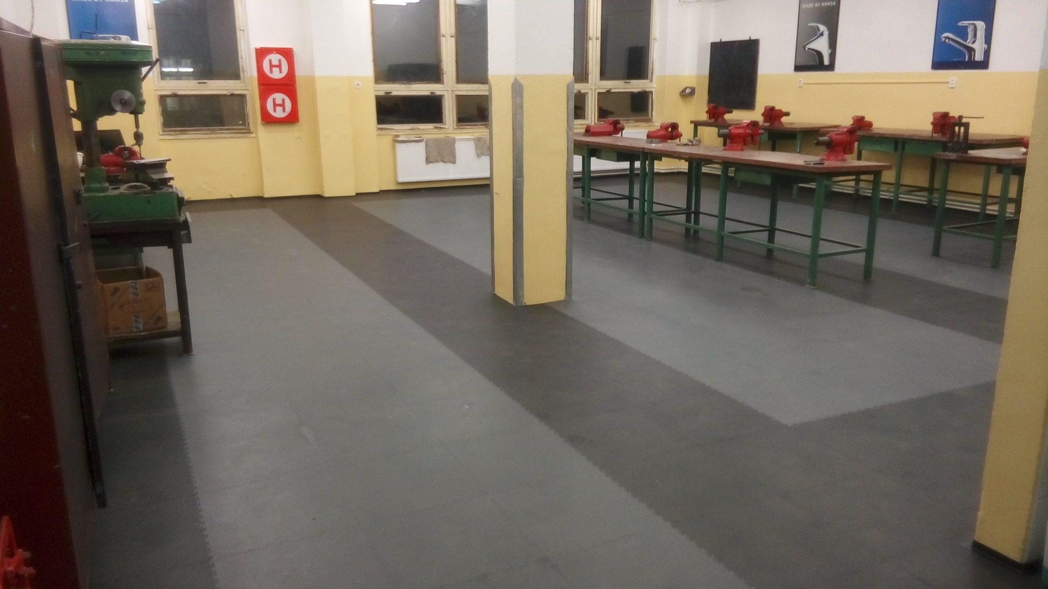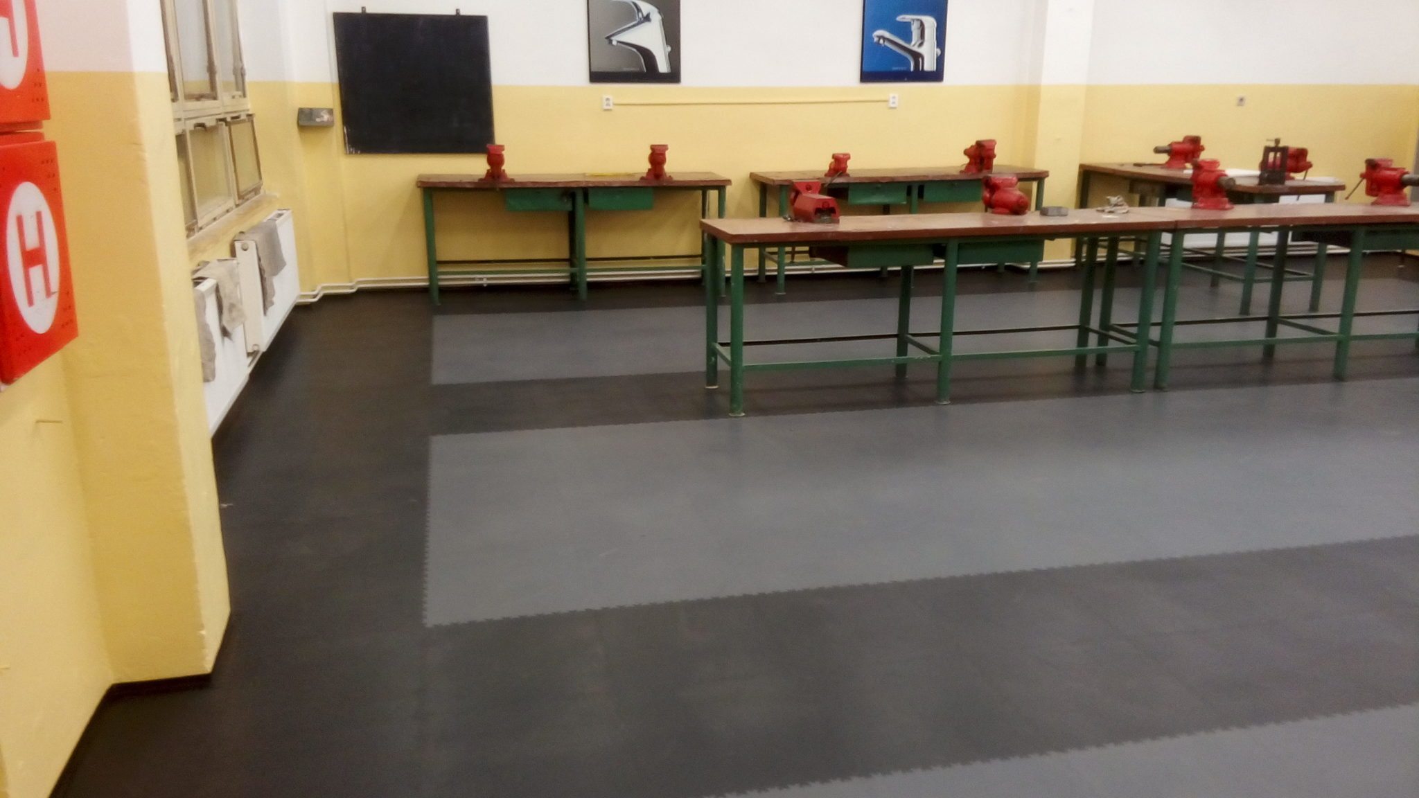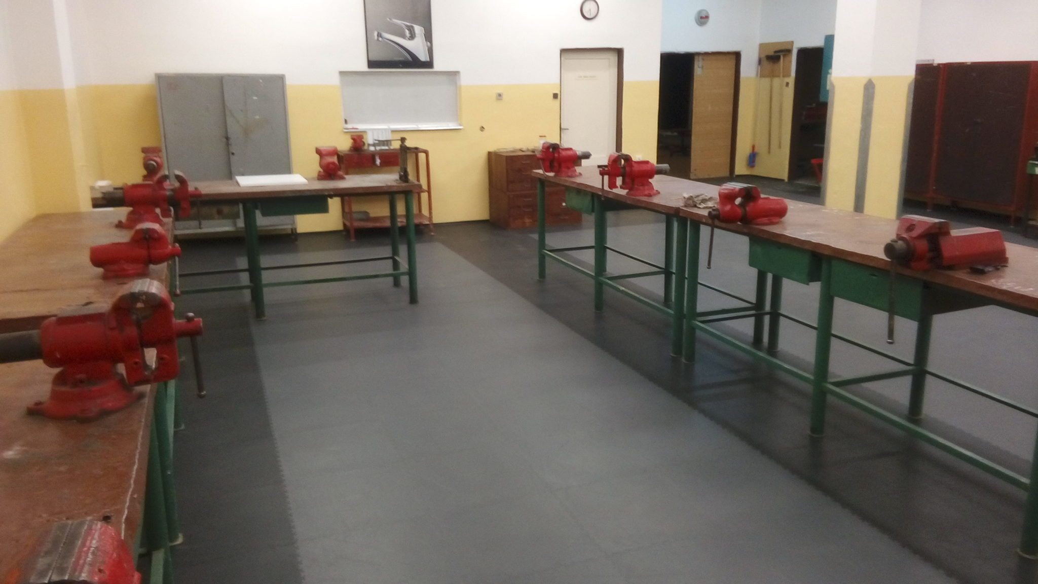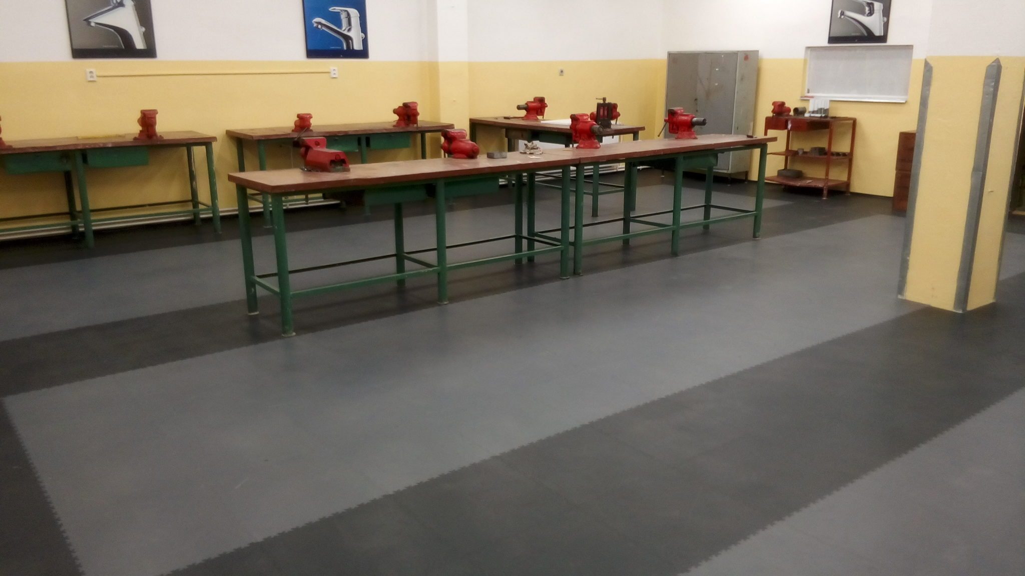 Auch in der Berufsschule für Verkehr und technische Handwerke wurde beschlossen das alte abgenutzte Linoleum durch PVC Fortelock Fliesen zu ersetzen. Einfache und schnelle Verlegung, Schleuderschutzoberfläche, Beschädigungsbeständigkeit und einfacher Austausch einzelner Teile auch langfristig. Das waren die Hauptgründe, warum in den Werkstätten die PVC Fliesen verlegt wurden.