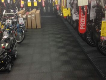 Verlegung von PVC Fortelock Fliesen im Geschäft Media Expert in Polen, in dem Fahrräder und Gartenzubehör verkauft werden. Die Auswahl der schwarzen Farbe korrespondiert perfekt mit dem Umfeld und erfüllt gleichzeitig die Erwartungen an ein einheitliches Design und eine einfache Pflege.