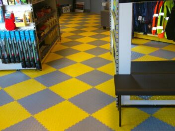 Ein Schachbrettmuster in den Farben Grau und Gelb, das ist das originelle Ergebnis einer Sanierung des ursprünglichen Bodens in einem Geschäft mit Autoersatzteilen und Kfz Zubehör. Die quadratische Form der PVC Industry Fortelock Fliesen ermöglicht eine spielerische Anordnung der Muster, die den jeweiligen Raum beleben und für Abwechslung sorgen. Die schnelle Verlegung mit dem Klick System und die minimalen Arbeiten an der ursprünglichen Unterlage ermöglichen eine Sanierung während des Geschäftsbetriebes, da dabei kein Schmutz entsteht.
