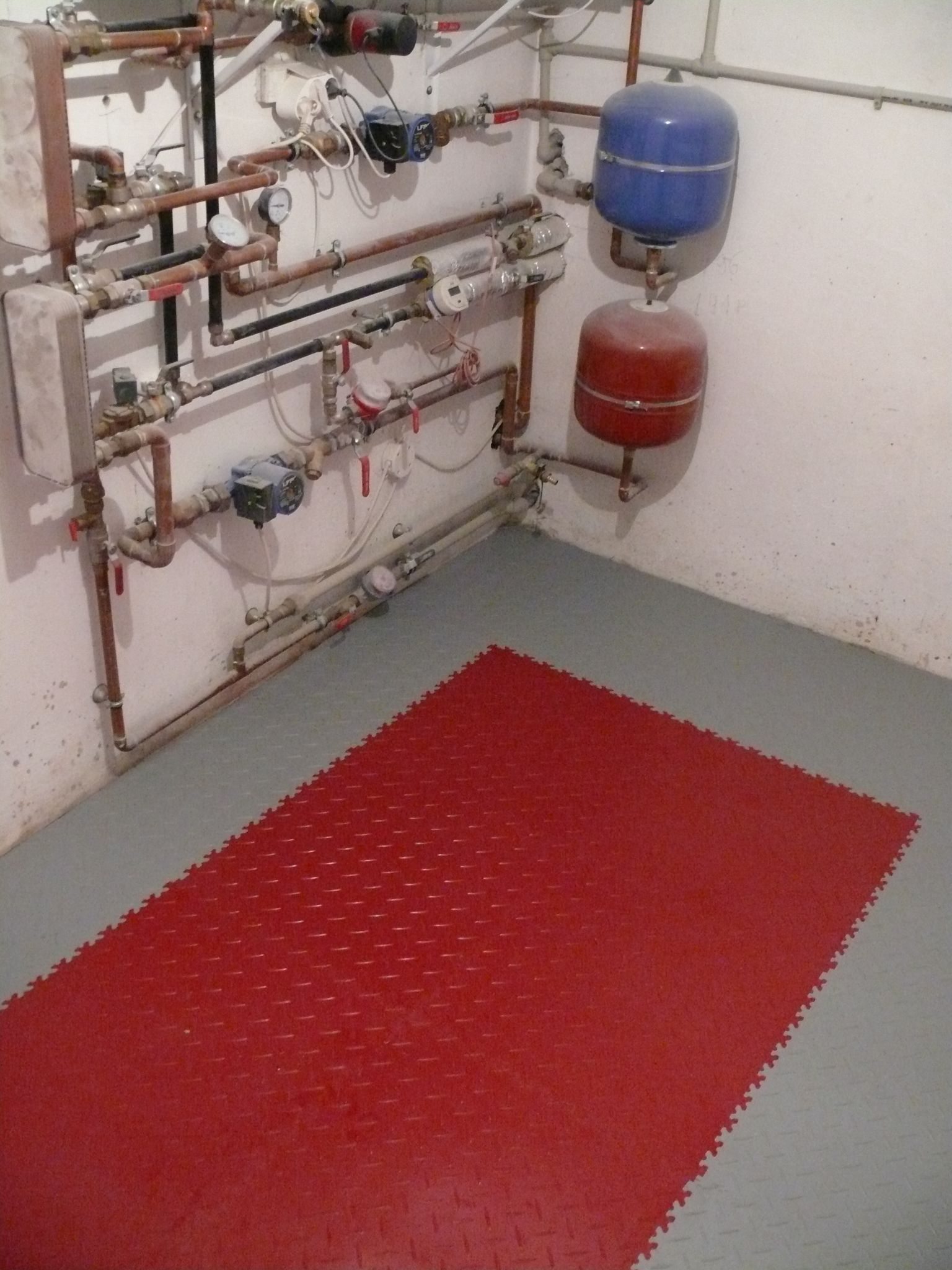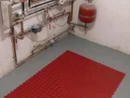 Bei der Renovierung dieses Technikraums wurden PVC-Fliesen Fortelock Industry in den Farben Grau und Rot verlegt. Das Verlegen geht sehr schnell und verlangte keine speziellen Anpassungen des Untergrunds. Falls Wasser aus den Rohren in diesem Raum entweicht, kann es einfach aufgewischt werden. Der Fußboden trocknet schnell und ohne die Gefahr, dass sich Schimmel bilden könnte.